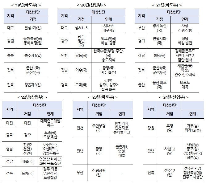 이에 정부는 노후화된 산업단지의 지속 가능성을 확보하기 위해서 ’19년부터 6년간 26개의 경쟁력강화사업지구를 지정하고, 국토부, 산업부 등 8개 중앙부처의 사업과 지자체 사업을 연계하여 디지털‧저탄소화 촉진, 근로‧정주여건 개선, 문화공간 확충을 적극 지원해오고 있다.