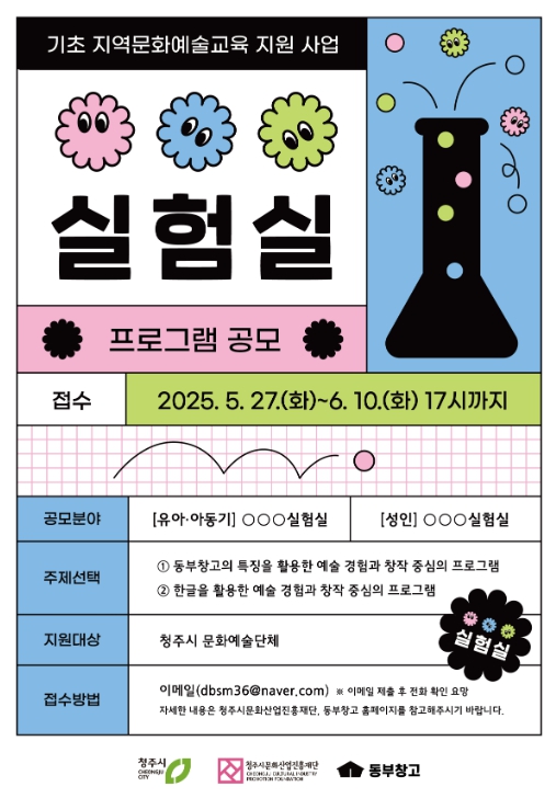 [무한뉴스=정민정 기자] 청주시문화산업진흥재단은 오는 6월 10일 오후 5시까지, 문화예술교육 실험 프로젝트 ‘OOO 실험실’을 공모한다.