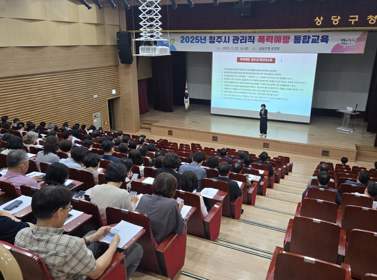 [무한뉴스=정민정 기자] 청주시는 22일 상당구청 대공연장에서 시 기관장과 고위직 공무원 185명을 대상으로 직장 내 4대 폭력(성희롱,성매매,성폭력,가정폭력) 예방 통합교육을 실시했다.
