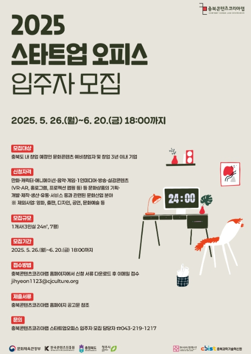 청주시가 주관하고 청주시문화산업진흥재단이 운영하는 충북콘텐츠코리아랩은 ‘스타트업 오피스’ 1개실(3인실) 입주자를 모집한다.