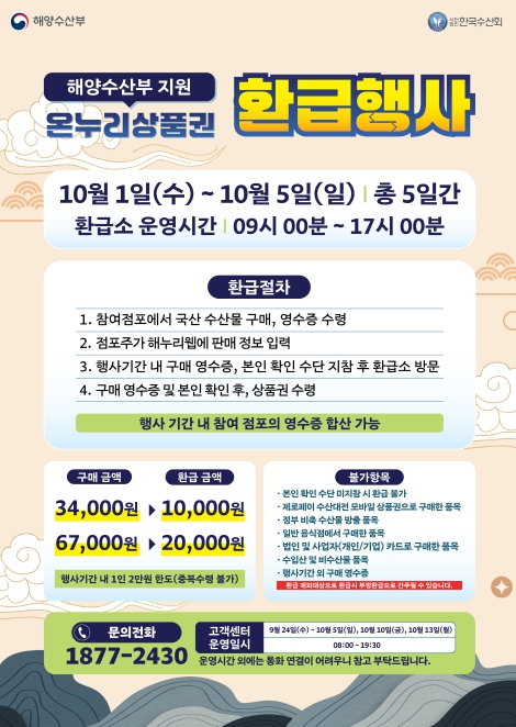 [무한뉴스=정민정 기자] 청주시는 추석을 맞아 수산물 소비 활성화를 위해 10월 1일부터 5일까지 전통시장 온누리상품권 환급행사를 추진한다.
