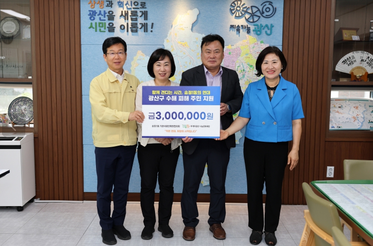 기영철 송정1동 기관사회단체장협의회장은 “지역 주민이 십시일반 모아준 기부금이 수해로 고통을 겪은 이웃들에게 위로와 용기가 되길 바란다”며 “앞으로도 어려운 이웃을 위한 연대와 나눔에 앞장서겠다”고 말했다.