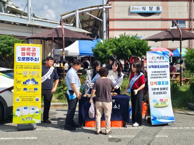 [무한뉴스=정민정 기자] 전남 무안군은 2025년 추석 명절을 맞이하여 29일 오전 무안전통시장을 찾아 지역 주민들과 시장 방문객들을 대상으로 지적재조사사업 및 도로명주소 합동 홍보를 실시했다.