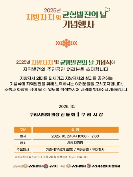 [무한뉴스=양현명 기자] 구리시의회는 오는 10월 29일에 구리시청 1층 대강당에서 ‘2025년 지방자치 및 균형발전의 날 기념식’을 개최한다.