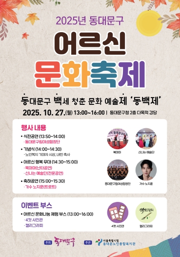 이번 축제는 지역 어르신들에게 다양한 공연과 문화 체험의 기회를 제공하기 위해 마련된 자리로, 동대문노인종합복지관(관장 김윤태)이 주관한다. 행사에는 관내 어르신 및 지역주민 등 800여 명이 참여할 예정이다.