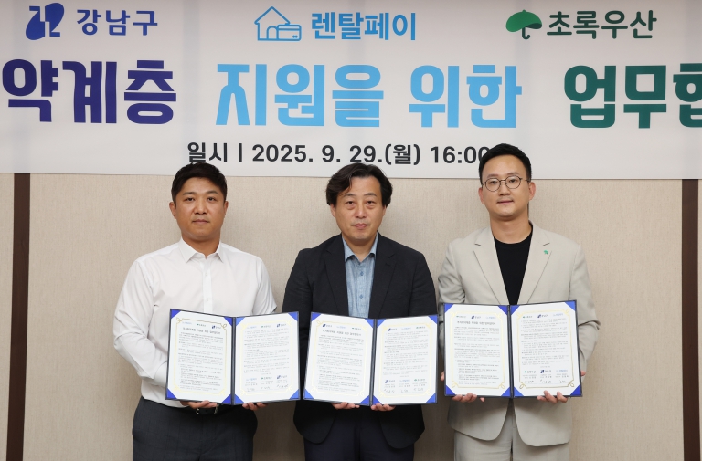 [무한뉴스=박노신 기자] 꿈이 모이는 도시, 미래를 그리는 강남구가 9월 29일 렌탈페이, 초록우산과 함께 주거취약계층 지원을 위한 3자간 업무협약(MOU)을 체결했다.