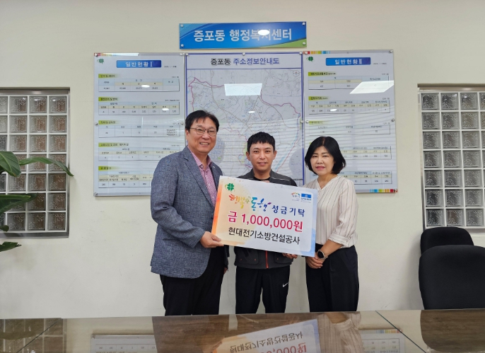 [무한뉴스=정충근 기자] 이천시 증포동은 9월 29일, 추석 명절을 앞두고 이천시에 있는 현대전기소방건설공사가 ‘행복한 동행’ 성금 100만 원을 기탁했다고 밝혔다.
