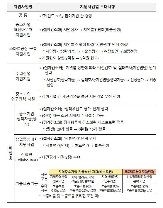 또한 정책자금, 창업·성장, R&D, 보증 분야에는 선정 절차 간소화, 평가 면제 또는 가점 부여, 지원한도 상향, 보증조건 우대 등 현장의 의견을 반영한 다양한 제도개선 사항이 적용된다.