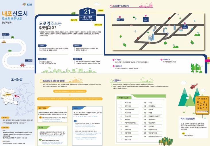 임택빈 도 토지관리과장은 “이번 도로명주소 안내도 배포로 내포신도시의 접근성과 이용 편의가 크게 향상될 것으로 기대되며, 위치 찾기 편의성과 행정 업무 활용성도 높아질 것”이라며 “앞으로 다국어 안내도 제작 등으로 외국인 방문객의 길 찾기에도 도움을 주고 도민의 다양한 요구를 반영해 최신 주소 정보를 지속적으로 제공할 것”이라고 말했다.
