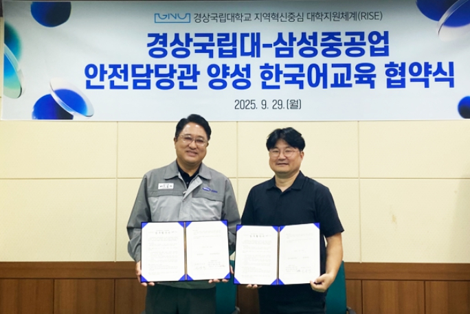 [무한뉴스=최진수 기자] 경상국립대학교 RISE사업단 산학친화프로그램과 삼성중공업은 9월 29일 오후 가좌캠퍼스 언어교육실 국제교육부처장실에서 외국인 근로자의 안전한 근로환경 조성과 지역사회 정주 여건 조성을 위해 ‘외국인 근로자 대상 한국어 교육체계 구축에 관한 업무협약’을 체결했다.