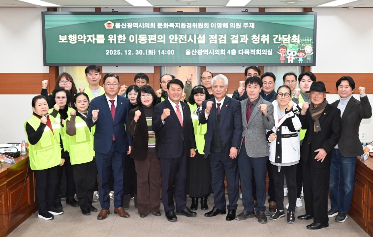 [무한뉴스=최진수 기자] 울산광역시의회 문화복지환경위원회 이영해 의원은 30일 오후 2시 4층 다목적회의실에서 '보행약자를 위한 이동편의 안전시설 점검 결과 청취 간담회'를 개최하고, 보행약자의 안전한 이동환경 조성을 위한 개선방안을 논의했다.