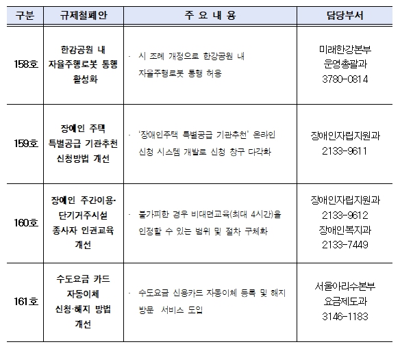 서울시는 내년 상반기 중으로 ▴한강공원 자율주행로봇 통행 허용(158호) ▴장애인주택 특별공급 기관추천 신청방법 개선(159호) ▴장애인시설 종사자 인권교육 개선(160호) ▴수도요금 카드 자동이체 개선(161호), 총 4건의 규제를 개선하겠다고 밝혔다.