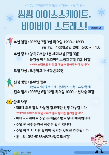 이번 프로그램은 양곡도서관의 교육발전특구 사업 중 하나로 다가오는 7월, 초등학생들을 대상으로 한다. 우선, 도서관에서 사서와 함께 감정 관련 그림책을 읽고 활동하며 자신이 가지고 있는 스트레스가 무엇인지 알아본 후, 운양동에 소재한 아이스링크장에서 신체활동(아이스스케이트)을 통해 스트레스를 풀 수 있는 시간으로 마련되어 있다.