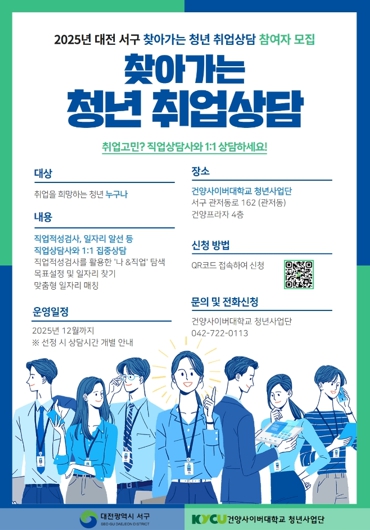 구는 이달부터 기존의 ‘청년 고독사 고위험군 지원사업’과 일자리지원센터의 취업 연계 기능을 결합해, 해당 청년들의 실질적 자립을 돕는 통합 지원체계를 구축했다. 건양사이버대학교 산학협력단에 상주하는 전담 상담 인력 3명이 △일대일 취업 상담 △직업 적성검사 △알선 취업 등 집중형 현장 서비스를 제공한다.
