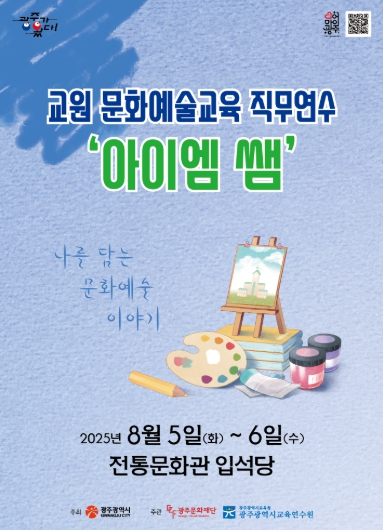 [무한뉴스=정민정 기자] 광주문화재단 문화예술교육지원센터는 오는 8월 5일부터 6일까지 전통문화관 입석당에서 ‘문화예술교육 연수 및 아카데미–서로배움’의 하나로 교원문화예술교육 직무연수 ‘아이엠 쌤’을 개최한다.