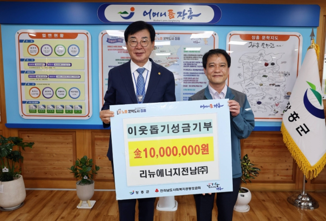 [무한뉴스=정민정 기자] 장흥군 장평면에 소재한 리뉴에너지전남(대표 최창배)에서 지난 19일, 지역 내 어려운 이웃을 위해 써달라며 이웃돕기 성금 1,000만 원을 장흥군에 기탁했다.