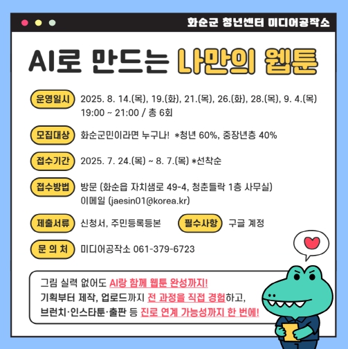 [무한뉴스=정민정 기자] 화순군(군수 구복규)은 오는 8월14일 저녁 7시 화순군 청년센터(청춘들락) 미디어공작소에서 화순군민을 대상으로 생성형 AI 기술을 활용한 웹툰 창작 교육을 진행한다고 밝혔다.