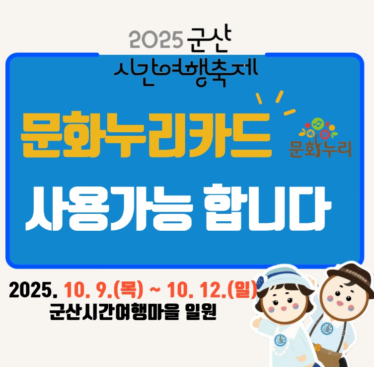 [무한뉴스=정민정 기자] 군산시가 12일까지 열리는 '2025 군산시간여행축제' 기간 동안 통합문화이용권(문화누리카드) 임시 가맹점을 운영해 시민들이 축제 현장에서 더욱 쉽고 편리하게 통합문화이용권(문화누리카드)를 사용할 수 있도록 지원했다.