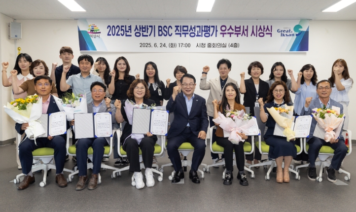 익산시는 24일 시청 중회의실에서 '2025년 상반기 BSC 직무성과평가' 우수부서 시상식을 개최했다. 이날 행사에는 정헌율 익산시장을 비롯해 기획예산과장, 수상 부서 직원 등 30여 명이 참석했다.