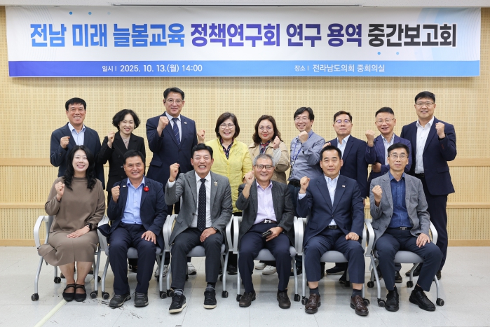 [무한뉴스=정민정 기자] 전라남도 의원연구단체 전남 미래형 늘봄교육 정책연구회(대표의원 정철)는 10월 13일 전라남도의회 중회의실에서 '전남 미래형 늘봄교육 모델개발과 학교 내외 안전사고 예방 방안 연구' 정책연구용역 중간보고회를 개최했다.