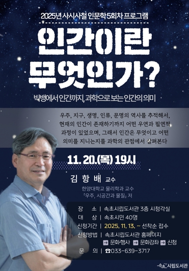 [무한뉴스=정민정 기자] 속초시립도서관은 11월 20일 19시, 도서관 시청각실에서 시민 40여 명을 대상으로 2025 사시사철 인문학 마지막 특강 ‘인간이란 무엇인가?’를 개최한다.