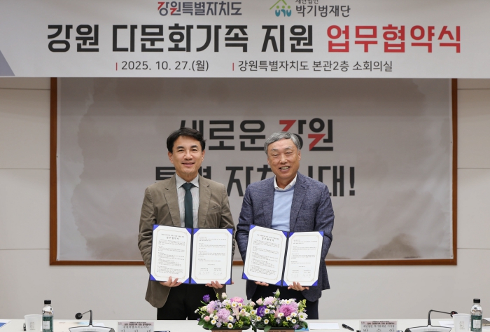 [무한뉴스=정민정 기자] 강원특별자치도는 10월 27일 오후 3시 30분, 도청 본관2층 소회의실에서 재단법인 박기범재단과 강원 다문화가족 지원을 위한 업무협약을 체결했다.