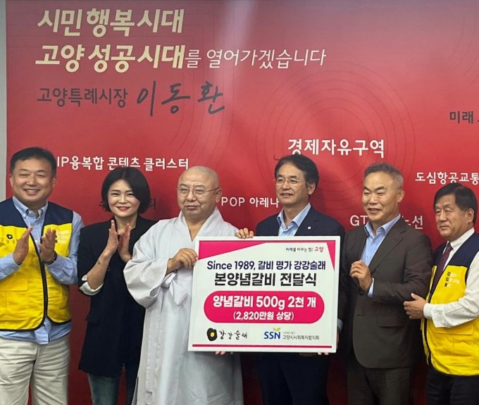 [무한뉴스=양현명 기자] ㈜전한의 외식브랜드 강강술래(대표 노상환)가 10월 10일, 고양특례시에 본양념갈비 500g 2,000개(2,820만 원 상당)를 기탁했다. 이번 전달식은 고양특례시청 열린시장실에서 진행됐으며, 이동환 고양특례시장, 김민숙 고양특례시의원(고양, 관산, 원신), 노상환 강강술래 대표, 김응화 고양시사회복지협의회 회장이 함께 자리했다.