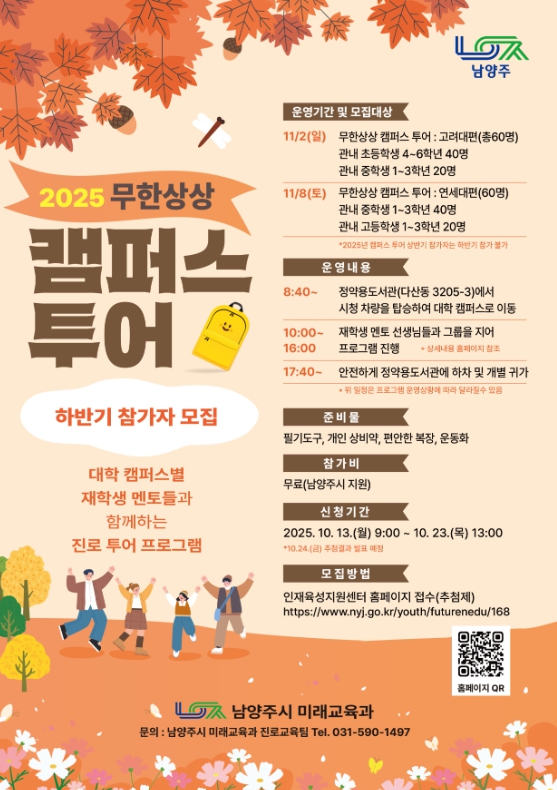 [무한뉴스=정승훈 기자] 남양주시는 10월 13일부터 10월 23일까지 관내 초등학교 4학년부터 고등학교 3학년을 대상으로 ‘무한상상 캠퍼스 투어’ 참가자를 모집한다.