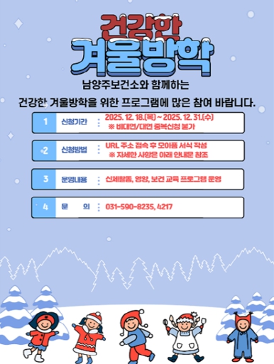[무한뉴스=정승훈 기자] 남양주보건소는 겨울방학 동안 관내 초등학생들을 대상으로‘초등학생이 건강한 겨울방학’프로그램을 이달 9일부터 내달 6일까지 4주간 운영한다고 7일 밝혔다.