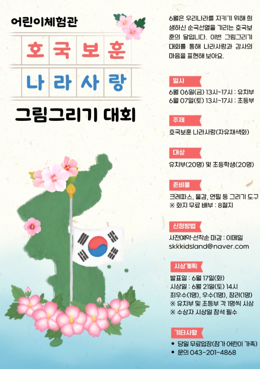 [무한뉴스=정민정 기자] 청주랜드관리사업소는 6월 호국보훈의 달을 맞아 다음달 6, 7일 어린이체험관에서 ‘나라사랑 어린이 그림그리기 대회’를 개최한다.