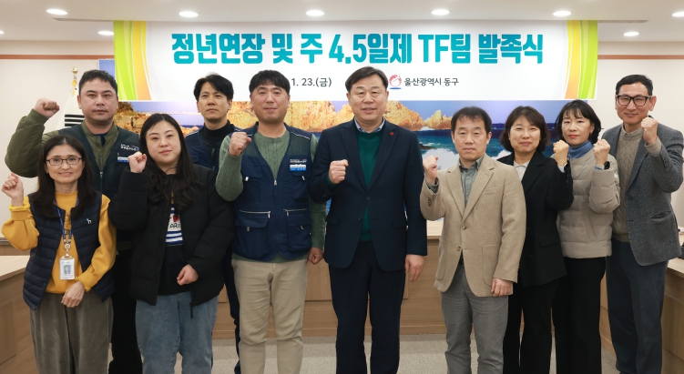 [무한뉴스=최진수 기자] 울산 동구는 1월 23일 오후 4시 동구청 상황실에서 구청장을 비롯해 자치단체공무직본부 동구지회장, 조합원 등 기관 및 노조 관계자 10명이 참석한 가운데 ‘정년연장 및 주 4.5일제 논의를 위한 TF팀 발족식’을 개최했다.