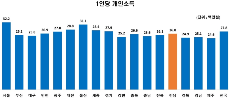 [무한뉴스=정민정 기자] 전남지역 2024년 ‘지역내총생산(GRDP)’이 크게 늘면서 ‘1인당 총생산’은 전국 4위, ‘1인당 개인소득’은 전국 8위를 달성한 것으로 나타났다.