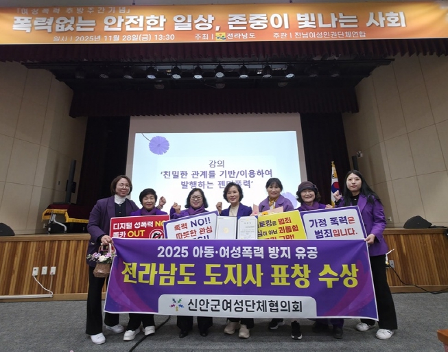 [무한뉴스=정민정 기자] 신안군여성단체협의회(회장 안미영)가 11월 28일 전남여성가족재단에서 개최된 ‘2025년 여성폭력추방주간 기념행사’에서 여성폭력 방지 유공을 인정받아 전남도지사 표창을 수상하는 영예를 안았다.