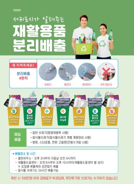 서귀포시 관계자는 “중동사태로 인한 석유화학 원료 수급 불안정에 따른 석유 기반 플라스틱 제품 사용 줄이기와 올바른 분리배출을 통한 자원 선순환 문화 조성이 필요하다”라며, “분리배출 책자 제작뿐만 아니라 시민 눈높이에 맞춘 다양한 분리배출 방법 홍보를 지속 강화해 나가겠다”라고 말했다.