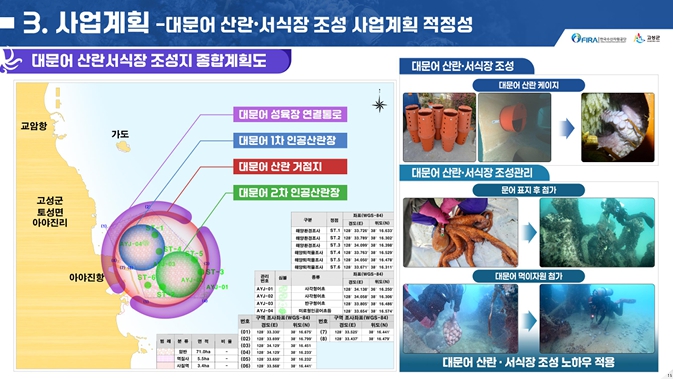 이번에 공모 선정된 사업은 동해안 대표 어종인 대문어의 인공 어장조성(산란장, 서식장 등) 및 자원조성(문어 자원 첨가)과 환경개선 및 효과조사 등을 추진하여 대문어 자원의 체계적인 관리와 수산자원 공급 거점 구축 등 수산자원의 지속적 이용 가능한 생산체계를 구축하는 사업으로 매년 10억 원씩 5년간 총 50억 원이 투자된다.