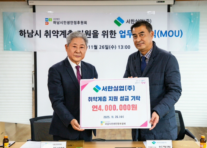 [무한뉴스=박노신 기자] 서한실업(주)와 하남시민생안정후원회는 11월26일 하남시 취약계층 지원을 위한 업무협약을 체결했다. 이번 협약을 통해 서한실업(주)는 연간 400만원 기탁하며 하남시의 이웃들을 위한 꾸준한 나눔 활동을 이어가기로 뜻을 모았다.