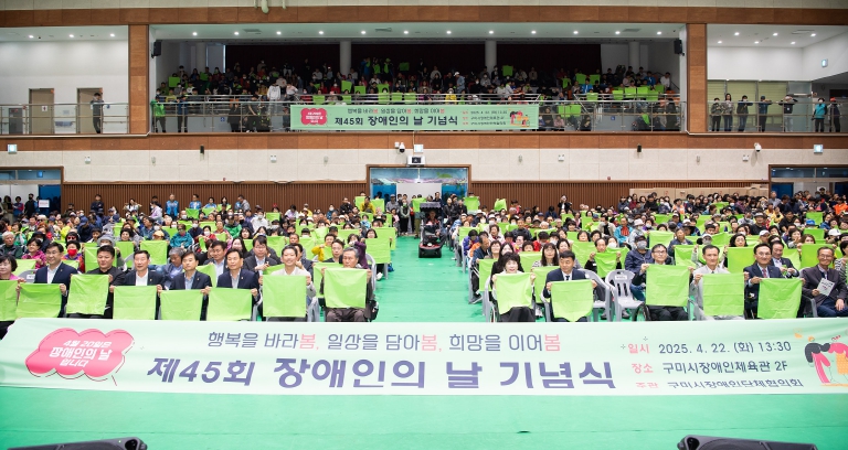 [무한뉴스=최진수 기자] 구미시는 22일 구미시장애인체육관에서 ‘제45회 장애인의 날 기념식’을 열었다. 이날 행사는 구미시장애인단체협의회 주관으로 열렸으며, 장애인단체장과 장애인복지 유공자 등 1,000여 명이 참석했다.
