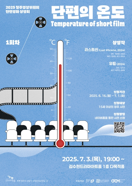 감도 높은 단편영화의 세계를 만나볼 수 있는 이번 ‘단편의 온도’ 상영회는 15세 이상 청주시민이면 누구나 함께할 수 있다. 선착순 110명까지 함께할 수 있으며, 포스터의 QR을 통해 신청하면 된다.