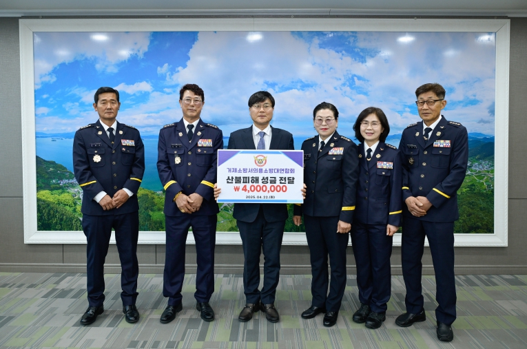 이번 기부는 거제소방서 의용소방대연합회 김종국 남성회장과 신채영 여성회장의 주도로 진행됐으며 거제소방서 의용소방대 28개대가 산불피해 지원 성금 모금에 참여했다.