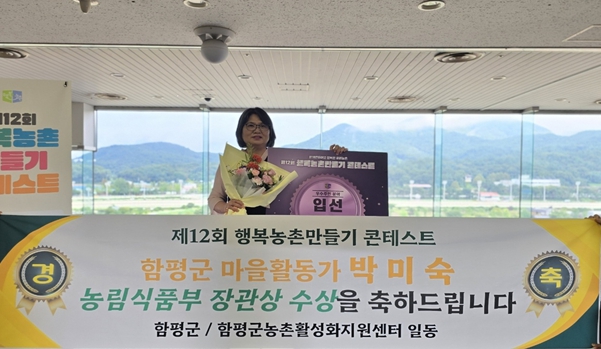 [무한뉴스=정민정 기자] 전남 함평군 마을활동가 박미숙 씨가 제12회 행복농촌만들기 콘테스트에서 우수주민(활동가) 부문 농림축산식품부 장관상을 수상하며 군민 자긍심을 높이고 있다.