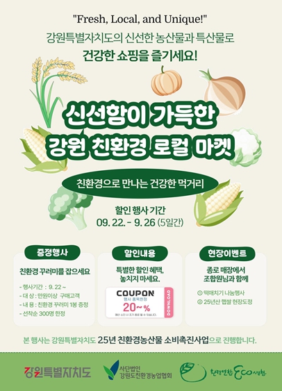 [무한뉴스=정민정 기자] 강원특별자치도는 9월 22일부터 26일까지 5일간 두레생협 전국 111개 매장에서 '강원특별자치도 친환경 로컬마켓 2탄'을 동시에 개최한다고 밝혔다.