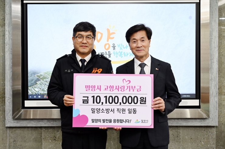 [무한뉴스=최진수 기자] 밀양시는 밀양소방서에서 17일 시장실을 방문해 고향사랑기부금 1,010만원을 기탁했다고 밝혔다.