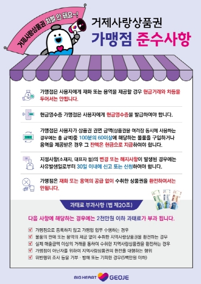 시 관계자는 “부정유통 근절을 위해 상시 모니터링을 실시하고 있으며, 소상공인연합회 및 전통시장상인회와 협력해 단속을 강화할 것”이라며, “앞으로도 신뢰받는 거제사랑상품권 운영을 통해 소상공인과 골목상권 활성화를 위해 최선을 다하겠다”고 말했다.