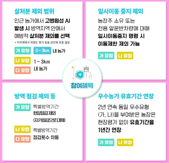 참여를 희망하는 농가는 관할 시군 농업기술센터(방역담당)에 신청하면 되며 유형별 혜택 등 세부사항은 해당 부서를 통해 안내받을 수 있다.