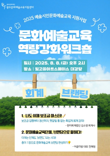 [무한뉴스=정민정 기자] 광주문화재단(대표이사 노희용) 문화예술교육지원센터는 오는 8월 8일 오후 2시, 빛고을아트스페이스 대강당에서 ‘문화예술교육 역량강화 워크숍’을 개최한다.