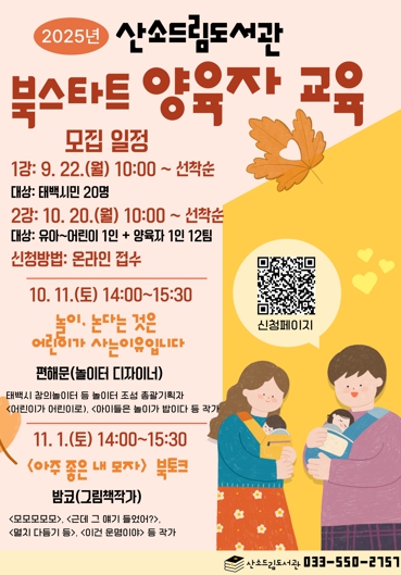 [무한뉴스=정민정 기자] 태백시는 산소드림도서관에서 북스타트 사업을 알리고 올바른 독서교육 방향을 제시하기 위해 “2025년 북스타트 양육자 교육”을 다음과 같이 운영한다고 밝혔다.