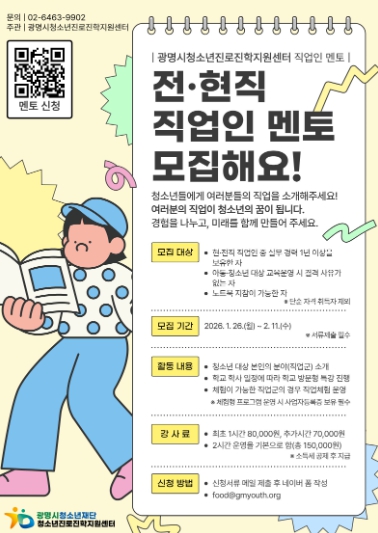 [무한뉴스=정승훈 기자] 광명시청소년재단 청소년진로진학지원센터는 관내 청소년들에게 현실적인 직업 정보와 체계적인 진로 설계 기회를 제공하기 위해 ‘2026년 직업인 멘토’를 신규 모집한다고 밝혔다.