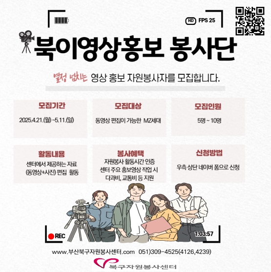 영상 제작에 관심이 있는 MZ세대라면 누구나 지원할 수 있으며, 자세한 내용은 부산북구자원봉사센터 홈페이지 공지 사항 또는 자원봉사포털을 통해 확인할 수 있다.