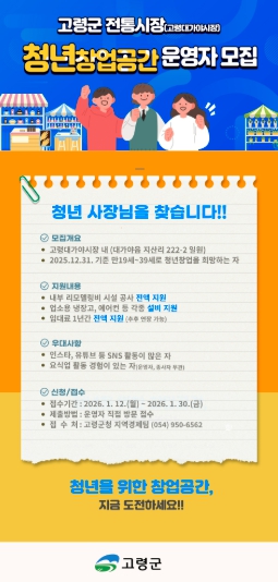 | ▲ 고령군, 전통시장 내 청년창업공간 운영자 모집 |