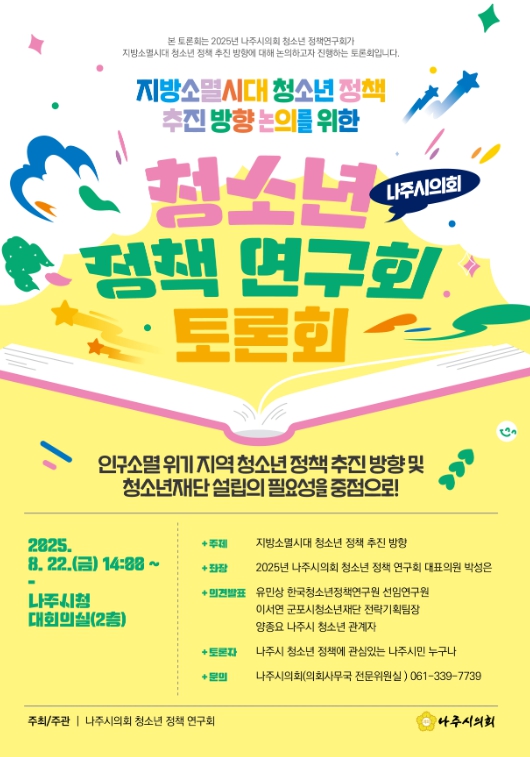 [무한뉴스=정민정 기자] 나주시의회 의원 연구단체 ‘나주시 청소년 정책 연구회는 오는 8월 22일 오후 2시, 나주시청 대회의실에서 '지방소멸 시대 청소년 정책 추진 방향'을 주제로 토론회를 개최할 계획이라고 7일 밝혔다.